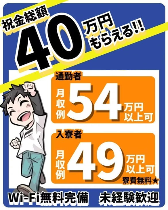 - 寮費無料(家具・家電・Wi-Fi完備)