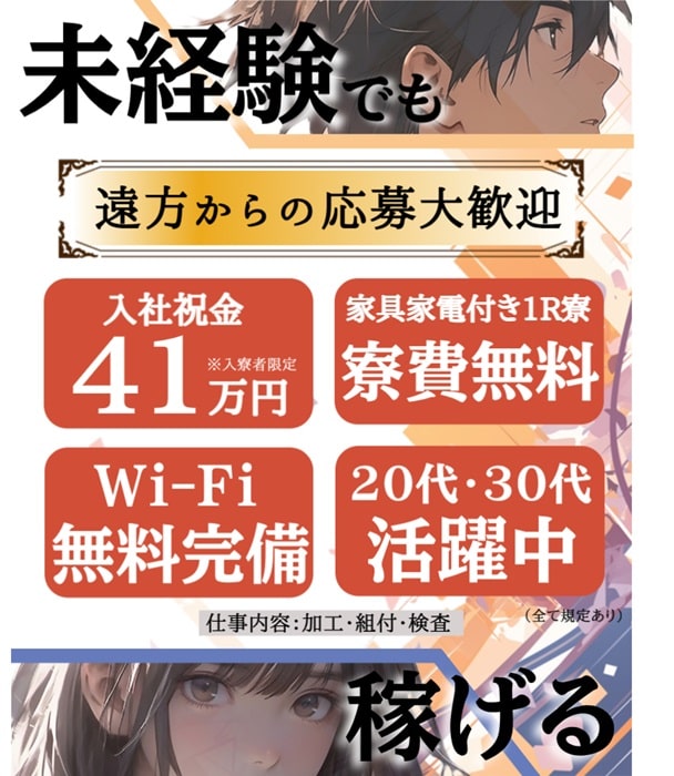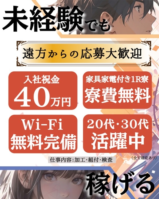 - 寮費無料(家具・家電・Wi-Fi完備)
