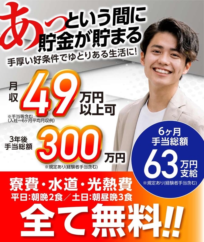 寮費・水道光熱費・寮の食事が無料で
