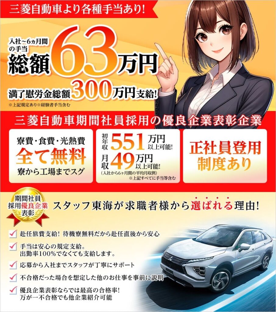 スタッフ東海は三菱自動車へ期間工の紹介も行っている会社です。