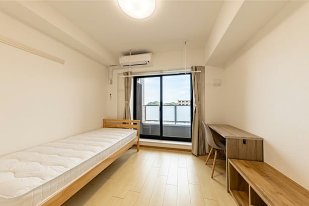 ミニキッチン、浴室、トイレを備え、ベッドやデスク、ローボードなど生活に必要な家具があらかじめ用意されています。