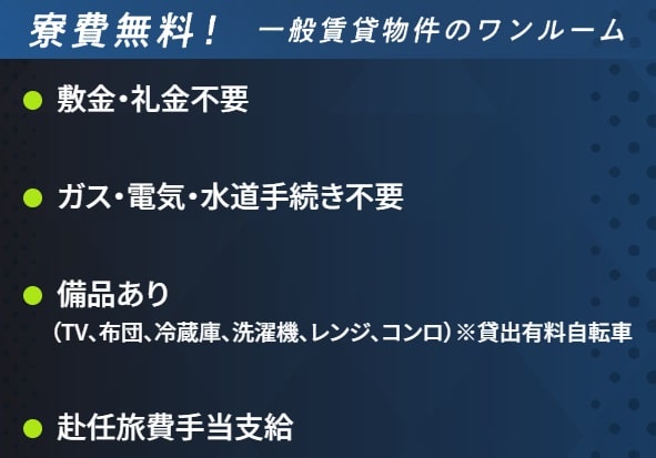家電と寝具は格安レンタルが可能だし、電気・水道・ガスなどライフラインは自ら業者と契約する必要なし。水道光熱費は給与から天引きです。
