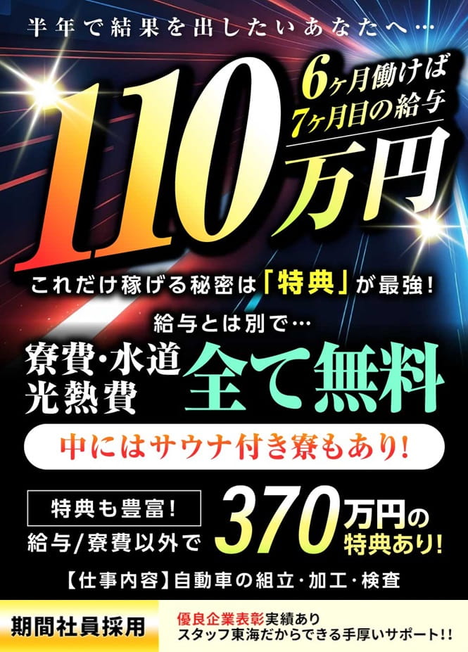 スタッフ東海からトヨタ自動車に応募するとプロによる面接対策でトヨタ期間工の内定率がアップします!愛知県には無料の待機寮もありますよ。